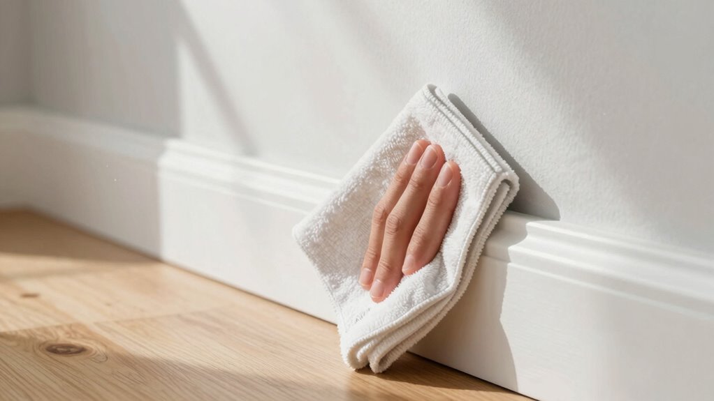 In high-traffic areas, you should clean your baseboards regularly to prevent dust accumulation and mold growth. Use a microfiber cloth or a soft brush to remove surface dirt, followed by a gentle natural cleaner or vinegar solution. Pay special attention to corners and edges. To prevent mold, guarantee proper ventilation and dry the baseboards thoroughly after cleaning. Consistent maintenance keeps your baseboards looking fresh and mold-free.