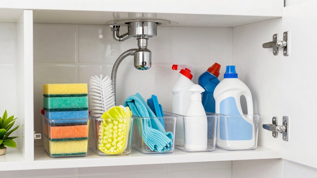 This approach keeps your supplies accessible, reduces clutter, and guarantees safety under your kitchen sink.