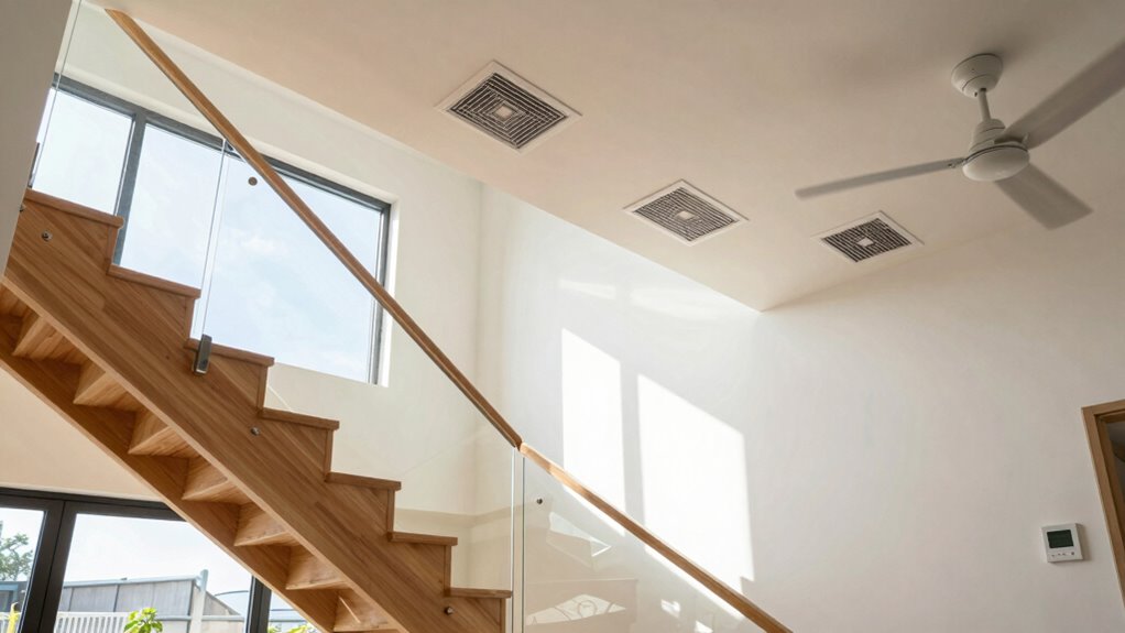 Using dampers and zoning systems is one of the most effective ways to balance airflow in a two-story home. Damper installation allows you to control airflow to specific areas, preventing hot or cold spots. Zoning strategies divide your home into separate zones, each with its own thermostat, giving you better temperature control. Incorporating smart home safety features can further optimize system performance and energy efficiency. Consider these key steps: