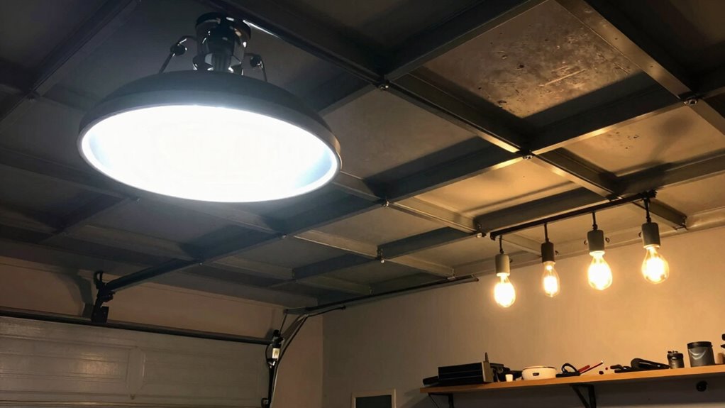Imagine your garage as a cozy fortress against harsh weather. Weather conditions greatly influence your lighting choices; you need weatherproofing considerations to keep moisture or dust out. Seasonal lighting adjustments are essential—brighter lights in winter for shorter days and softer tones in summer. By selecting fixtures with proper seals and adaptable brightness levels, you’ll guarantee your garage stays well-lit, safe, and inviting regardless of rain, snow, or shine.