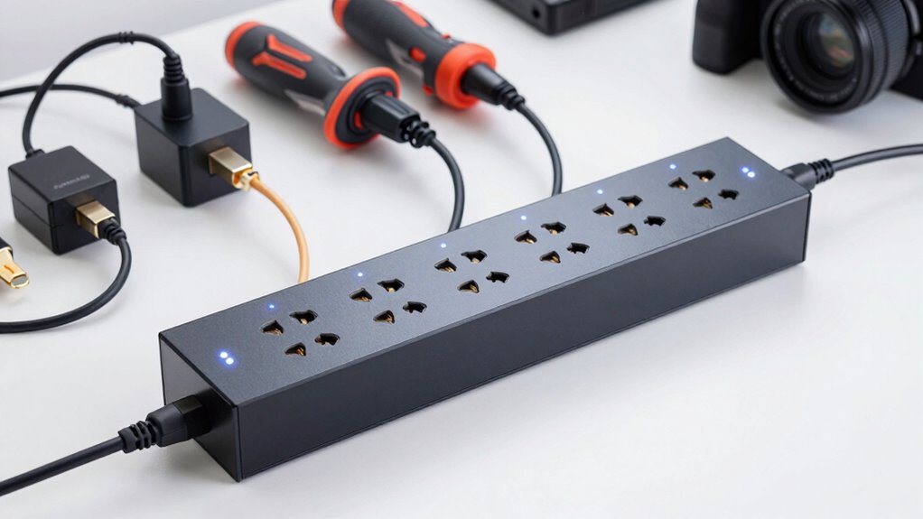 Surge protectors shield your power tools by blocking sudden voltage spikes that can cause damage. They absorb or divert excess energy, preventing it from reaching your equipment. This process helps prevent equipment damage, and by doing so, it also helps maintain the performance and efficiency of your tools. Additionally, using surge protectors for chargers and power tools helps maintain the overall security of your electrical system. Properly protecting your tools not only preserves their functionality but also contributes to a safer home environment, reducing the risk of electrical hazards. Incorporating reliable surge protection devices can further enhance the safety and longevity of your electrical setup.