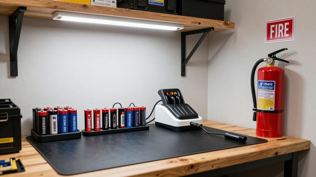 Smoke and heat detectors are vital safety devices that quickly alert you to fires, giving you precious time to respond or evacuate. Smoke detection and heat sensors work together to identify potential fire hazards early, even before flames become visible. Smoke detectors typically activate when smoke particles reach a certain concentration, while heat sensors trigger alerts when temperatures rise rapidly. Installing these devices near your tool battery charging station guarantees you’re immediately notified of any fire risk. Proper placement is essential—place smoke detectors on the ceiling or high on walls, and heat sensors near equipment prone to overheating. Regular testing and maintenance keep these safety devices functioning correctly, helping you prevent fire damage and protect your workspace.
