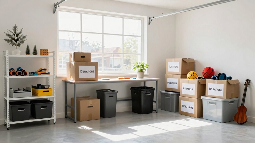 Start by quickly evaluating your garage to identify clutter hotspots. Keep essentials that are useful and in good condition, while setting aside items to donate if still valuable, or trash if broken or outdated. Use clear bins, labels, and wall racks to organize what’s left for easy access. Regularly review and tidy up to maintain order. Want tips on making this process even faster? Keep going for more helpful strategies.