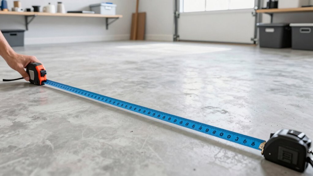 To start, you need to measure your garage’s length accurately from wall to wall. Next, determine the width by measuring across the garage floor at multiple points to guarantee consistency. Finally, check the ceiling height from the floor to the ceiling to plan for any overhead storage or fixtures.