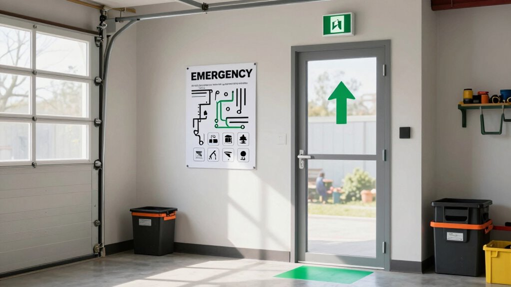 Creating a straightforward emergency exit plan guarantees everyone in your garage knows exactly what to do during a crisis. Start by clearly identifying the safest exit routes, ensuring garage lighting is adequate so everyone can see the path. Keep storage organized so escape paths aren’t blocked by clutter or boxes. Map out a step-by-step process, such as: