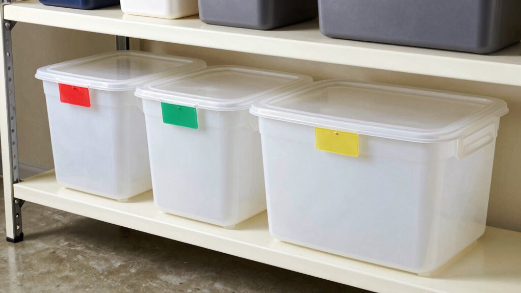 With uniform sizes, your labels stay aligned, and color coding becomes more intuitive. This consistency helps prevent clutter, saves space, and makes inventory management straightforward. By sticking to standardized tote sizes, your garage remains organized and accessible, even as you add or remove items.