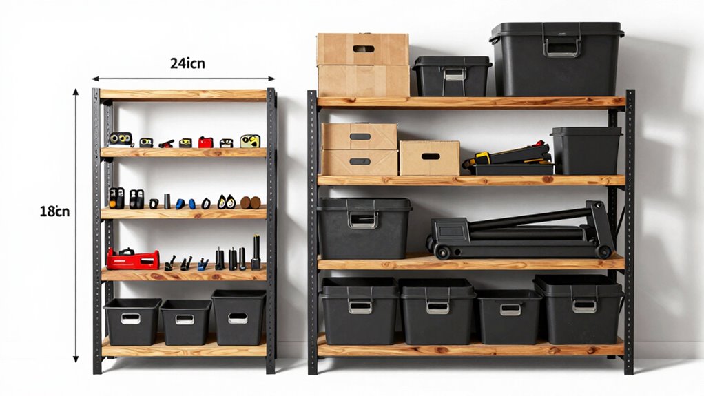 Are there alternative shelf depths that can better suit your storage needs? Yes, aside from the common 18 and 24 inches, you can explore other options like 12-inch or custom depths. These alternatives can optimize space for specific items, such as small tools or decorative pieces. Additionally, considering alternative materials like metal, wood, or plastic can enhance durability and style. Decorative options, like painted or finished shelves, allow you to match your garage’s aesthetic while remaining functional. Custom depths give you flexibility, so you can tailor your storage to fit your unique collection of tools, sports gear, or collectibles. By choosing the right depth and materials, you create a more efficient, visually appealing storage system that adapts perfectly to your needs.