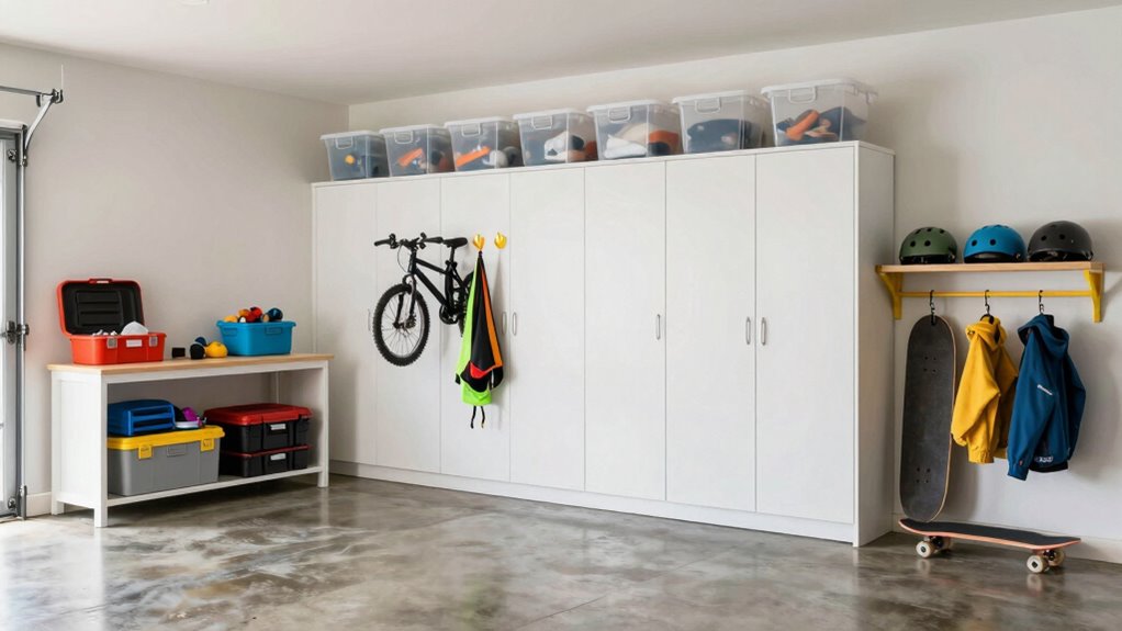 Creating easy-access storage areas for kids’ items guarantees they can find and put away their belongings without hassle. To keep your garage organized and kid-friendly, consider designated zones for their treasures.