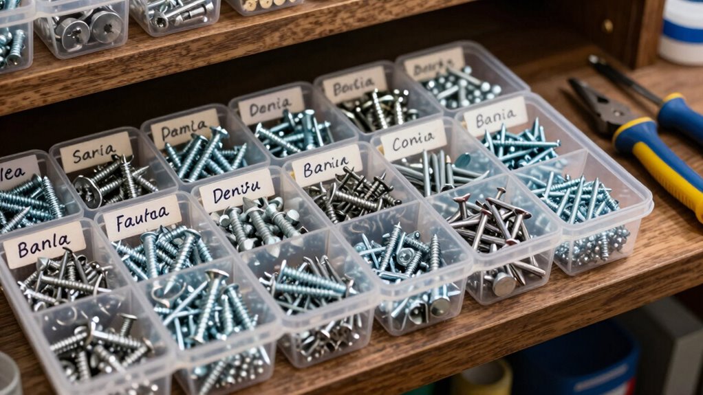To keep your hardware organized and easily accessible, maintaining a consistent system is vital. Labeling your hardware ensures quick identification and preserves screw categorization, which is essential for hardware durability. A clear labeling system reduces the risk of using incompatible screws, protecting your tools and projects.