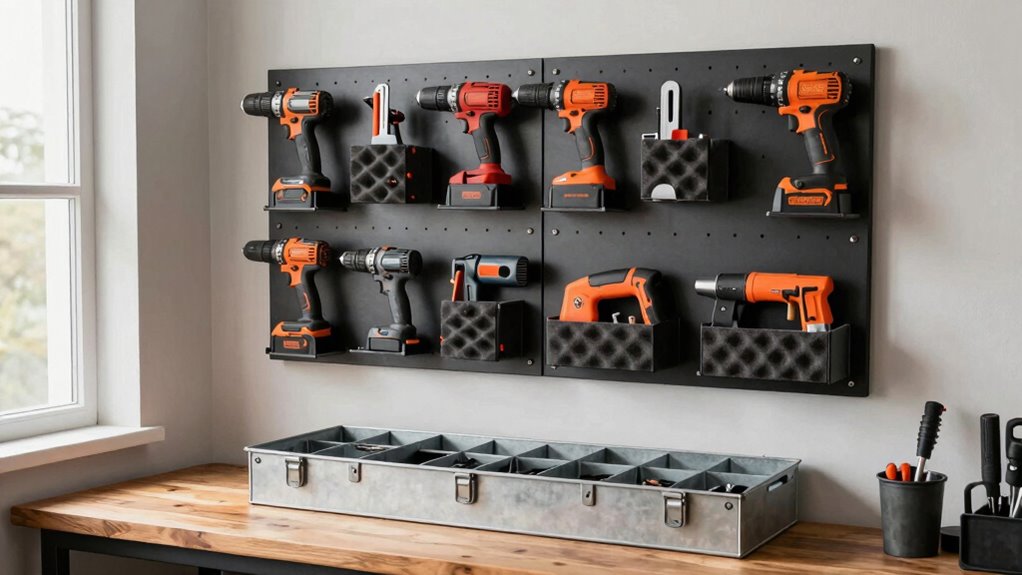 Wall-mounted racks and pegboards offer an efficient way to keep your power tools accessible and visible. You can customize your setup with magnetic strips for easy access to metal parts or small tools, reducing clutter and saving space. Pegboards allow you to hang tools securely, making it simple to grab what you need quickly. For added protection, use foam inserts in tool holders or on shelves to prevent scratches and damage. These storage solutions keep your workspace organized, making it easier to find tools without digging through drawers. Plus, they maximize vertical space, especially in smaller areas. With adjustable hooks and accessories, you can tailor your wall-mounted system to fit your tool collection perfectly, ensuring everything stays safe and easy to reach. Incorporating proper storage techniques can also help prevent damage caused by water or humidity, extending the life of your tools.