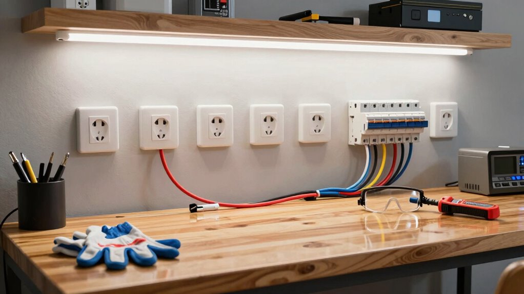 Have you ever wondered how to guarantee your electrical outlets and circuits are both safe and efficient? Proper circuit load management starts with strategic outlet placement to prevent overloads. Distribute power evenly by balancing circuits, ensuring no single one handles too much. This involves dividing high-wattage tools across different circuits and avoiding overloading a single outlet. Use circuit breakers that match the load capacity, and regularly check for signs of overload, like tripped breakers or warm outlets. By planning your outlet placement thoughtfully and maintaining circuit balance, you reduce the risk of electrical fires and damage. Effective load management ensures your workshop runs smoothly, safely, and efficiently, protecting both your tools and yourself.