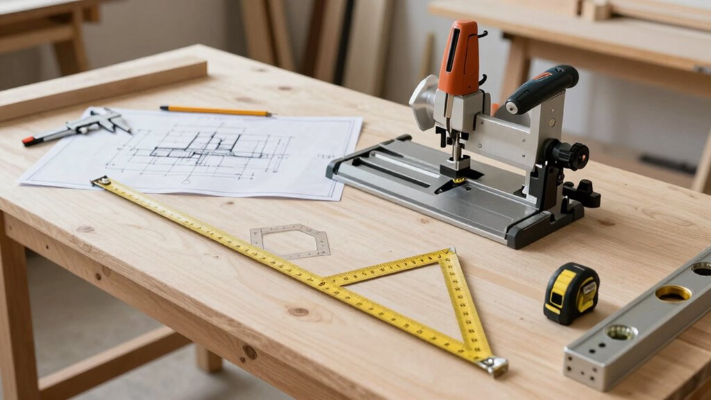 Start by measuring your workspace’s available space, including height, width, and depth. Focus on determining the height for comfortable working posture and support surface depth to guarantee stability. Check the maximum cut capacity and blade clearance to confirm your saw will fit and operate safely. Plan for power outlets and dust collection for efficiency. Proper measurements of storage needs also help keep your workspace organized. Keep these basics in mind to create an efficient, safe layout, and you’ll find out more as you continue.