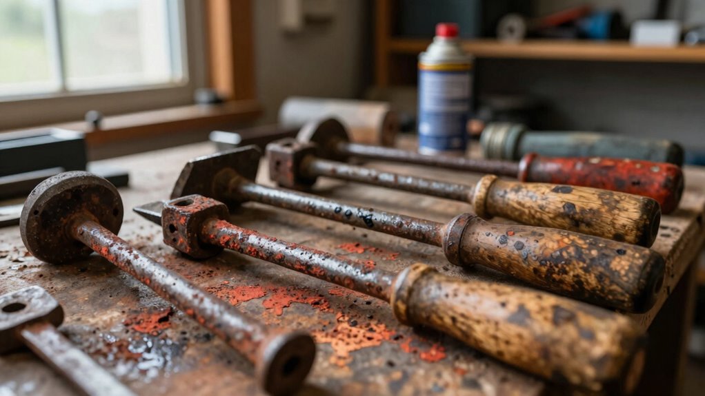 Understanding these causes helps you avoid common pitfalls. Rust doesn’t just happen randomly; neglecting proper tool maintenance invites corrosion. Recognizing what triggers rust allows you to take better care of your tools and dispels the rust myths that mislead many homeowners. Applying essential oils for protective coatings can also provide an extra barrier against moisture and corrosion. Additionally, using appropriate storage conditions can significantly reduce exposure to humidity and moisture, further protecting your tools from rust. Incorporating desiccants or dehumidifiers into your storage space can also help maintain a dry environment, reducing the likelihood of rust formation.