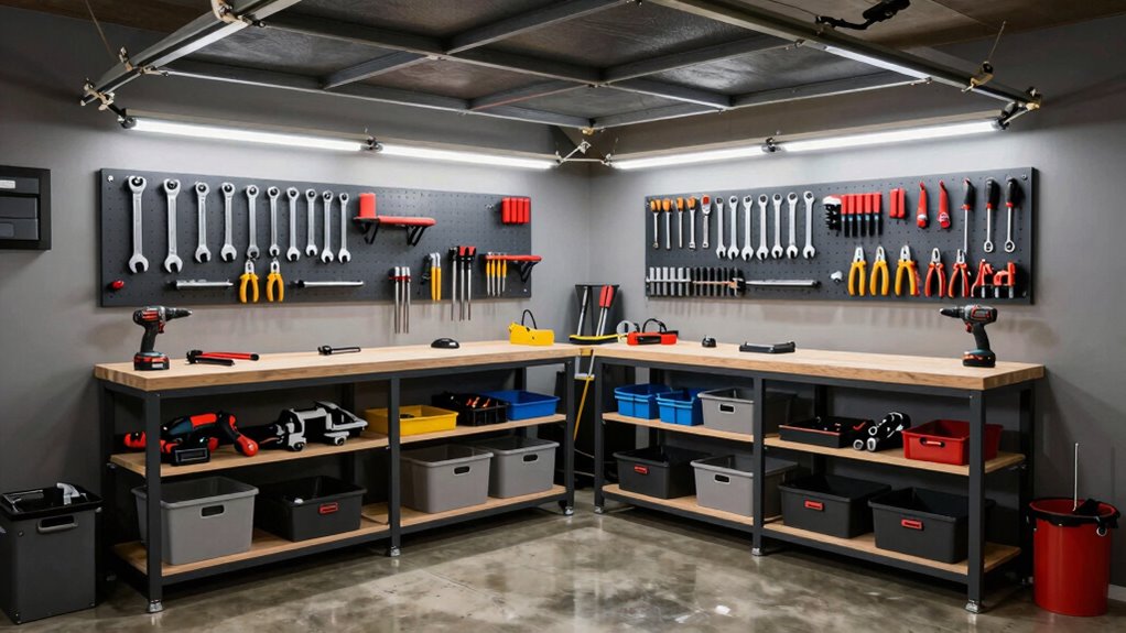 To guarantee your garage workshop functions smoothly, assembling an essential tool inventory is crucial. You need reliable power tools, hand tools, and safety gear stored for quick access. Regular power tool maintenance keeps them in top shape, preventing breakdowns. Prioritize safety gear storage to ensure your safety equipment is organized and ready when needed.