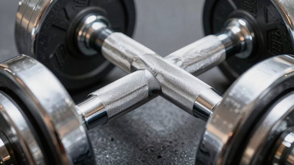 Pin and lock mechanisms in adjustable dumbbells rely on a straightforward process to secure weights at your desired level. When you choose your weight, you insert the pin into the corresponding hole, locking the plates in place. This system simplifies weight selection and accelerates your workout shifts. To guarantee mechanism compatibility, check that the pin fits snugly and aligns with the plate holes. Proper mechanism design ensures safety and durability during use.