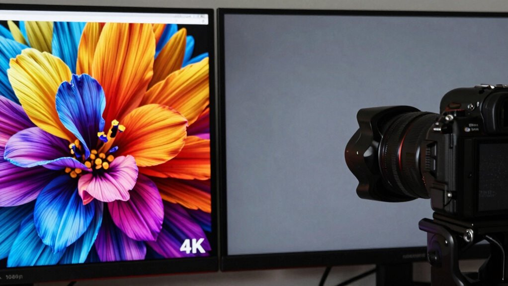 You’ll find that color accuracy varies mainly due to display calibration and color calibration quality, not just resolution. 4K monitors often offer better color precision because they support higher-quality panels and more advanced calibration tools, leading to more accurate colors. However, both 4K and 1080p screens can achieve excellent color accuracy if properly calibrated. Regular display calibration guarantees consistent, true-to-life colors, regardless of resolution.
