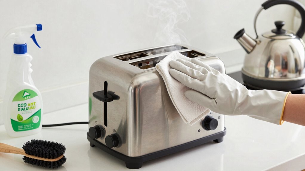 To keep small appliances like toasters and blenders functioning their best, it’s important to clean them regularly to prevent buildup of crumbs, residue, and stains. For toaster maintenance, unplug the appliance, remove the crumb tray, and shake out loose crumbs. Wash the tray with warm, soapy water and dry thoroughly before reinserting. Wipe down the exterior with a damp cloth. When it comes to blender cleaning, disassemble removable parts like the jar and blades. Wash these parts with warm, soapy water or run them through the dishwasher if safe. Wipe the blender base with a damp cloth, avoiding water contact with electrical components. Regular cleaning guarantees your small appliances stay in top shape and perform efficiently.