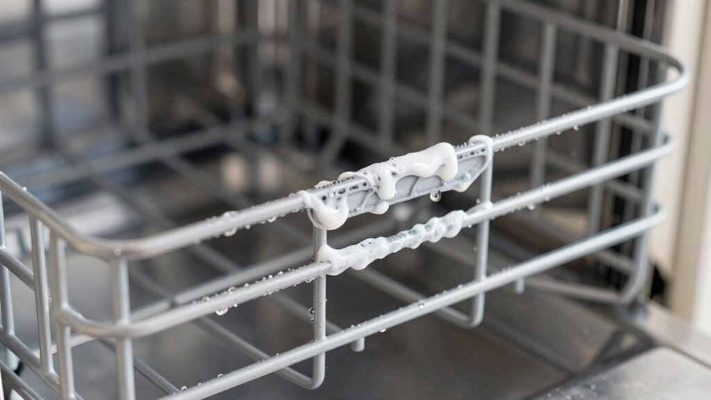 Clogged spray arms are a common culprit behind residue left on dishes after a dishwasher cycle. Over time, spray arm blockages can occur due to debris, food particles, or mineral deposits, restricting water flow. These blockages cause water circulation issues, preventing the dishwasher from rinsing dishes thoroughly. When water can’t reach all areas effectively, residue and spots remain. To fix this, remove the spray arms and inspect for clogs. Use a brush or toothpick to clear any debris from the holes. Regular cleaning guarantees proper water flow and prevents buildup. Additionally, understanding test accuracy and proper maintenance techniques can help prevent mineral deposits that contribute to clogging. Proper installation techniques and regular inspections can also extend the lifespan of your dishwasher components. Ensuring the use of appropriate detergents can further reduce mineral buildup and keep your spray arms clear. Incorporating preventative maintenance routines can significantly reduce the chance of future blockages and residue buildup. Being aware of water quality can also help you choose the right cleaning products and reduce mineral deposits.