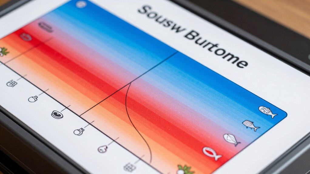 Creating your own custom sous vide temperature chart starts with understanding the ideal core temperatures for different levels of doneness and food types. To achieve consistent results, select core temperatures that guarantee flavor infusions penetrate thoroughly while maintaining temperature stability. For instance, lower temperatures are perfect for delicate textures like salmon, while higher settings are better for tougher cuts like beef brisket. Adjusting these temperatures allows you to tailor your dishes to your preferences. Keep in mind that small changes can dramatically impact texture and flavor. By carefully choosing your core temperatures, you create a reliable foundation for your sous vide recipes. This systematic approach assures your food is cooked perfectly, flavor infusions are maximized, and the temperature remains stable throughout the process.