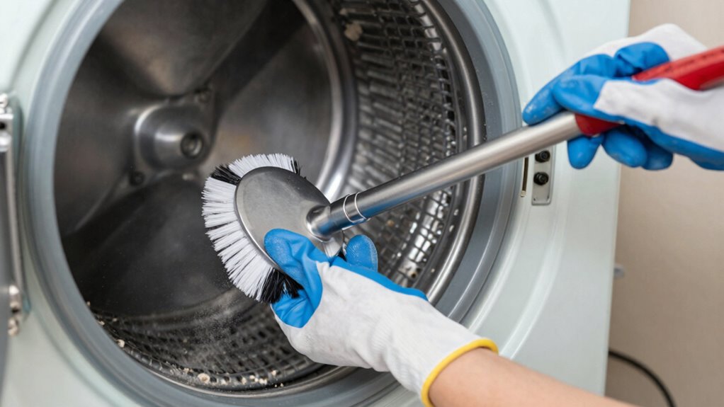 Cleaning your dryer vent at home is a straightforward process that can markedly improve your dryer’s efficiency and safety. First, unplug your dryer and move it away from the wall. Use vent cleaning tools like a long brush or flexible dryer vent brush to reach into the duct. Insert the brush and spin it to loosen lint buildup, then pull it out along with the debris. Repeat as necessary until the vent is clear. Be mindful of DIY safety: wear gloves and a mask to avoid inhaling lint dust, and guarantee the dryer is unplugged throughout the process. Regular maintenance with the right tools keeps your dryer running efficiently and reduces fire risks. Always follow safety precautions to avoid accidents or damage.