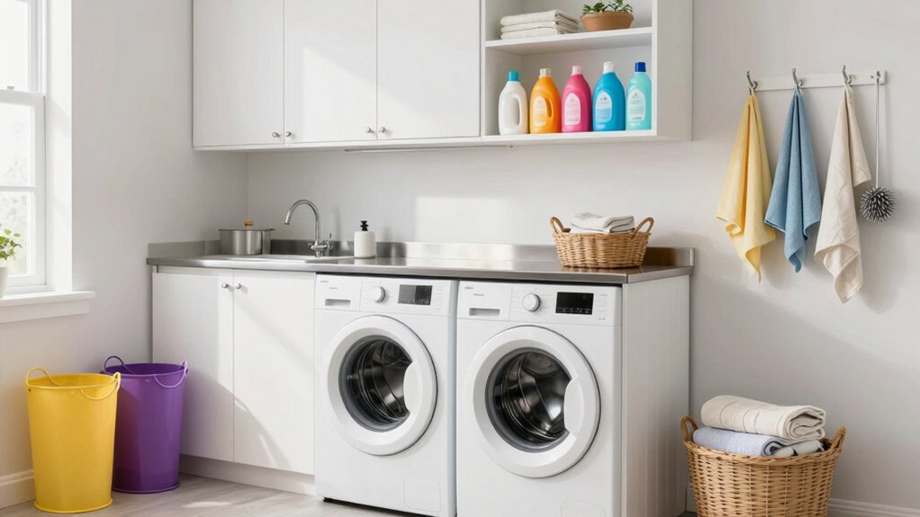 Before organizing your laundry room, you need to evaluate its space and storage needs. Start by considering your laundry room design and how appliances are placed. Measure the available area and identify any awkward corners or narrow spaces. Think about the size and number of appliances, like your washer and dryer, and how they fit into your layout. Proper appliance placement is key to creating an efficient workflow, so decide whether stacking units or side-by-side placement works best. Assess what storage options you require—shelves, cabinets, or hampers—and determine where they should go. Incorporating natural light into your laundry space can enhance its functionality and create a more welcoming environment. Additionally, considering projector technology can help inform your choices if you’re also integrating multimedia or entertainment features into your space. Exploring smart furniture options, like ladder racks or smart beds, may also provide innovative storage solutions that save space and add convenience. To optimize your laundry room further, researching space-saving solutions can help you maximize every inch of available area. Incorporating storage customization ideas tailored to your needs can further enhance organization and efficiency.