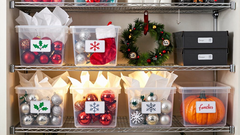 To store seasonal decorations properly, start by evaluating your current collection and organizing items by holiday in labeled, clear containers. Use sturdy, stackable boxes with dividers for fragile ornaments and wrap delicate pieces in tissue or bubble wrap. Protect lights by coiling cords and storing them separately. Keep everything in a cool, dry place and check regularly for damage. If you’re curious about creating an efficient storage system, there’s more to discover below.