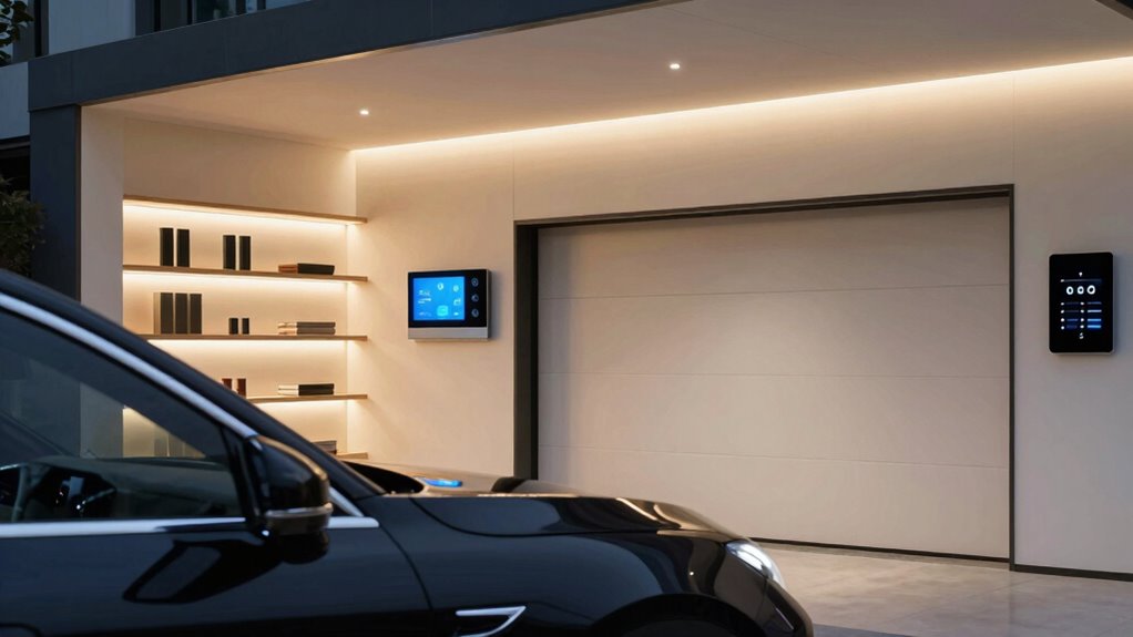 Automating your garage lighting enhances both convenience and security by ensuring the space is well-lit whenever you need it. You can set up smart garage lighting to turn on automatically when you approach, using motion sensors or security sensors. These sensors detect movement or activity, triggering the lights to activate instantly. This not only makes it easier to find your way in the dark but also deters intruders by keeping the area illuminated. You can customize the lighting schedule or set it to respond to specific triggers, like opening the garage door. With automation, your garage stays brightly lit during evening hours without manual effort, creating a safer environment and providing peace of mind. Incorporating lighting automation into your backyard transformation can seamlessly blend security and aesthetics for a more functional outdoor space. Additionally, selecting appropriate sensors ensures reliable activation and energy efficiency. As security systems are proven to deter potential burglars, integrating these systems with your garage automation can further enhance overall home safety and deterrence of criminal activity. Incorporating local automation can also help you manage your system more efficiently and maintain privacy in your smart home setup.