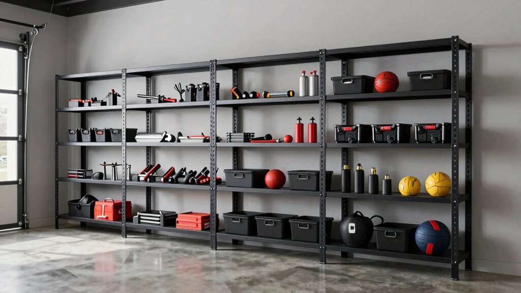 When it comes to maximizing storage space in my garage, choosing the right shelving system is essential. Adjustable garage shelving allows me to customize heights, making it easy to utilize vertical space and accommodate various item sizes. By using the full height of my garage, I can greatly boost storage capacity—some systems can hold up to 3,000 lbs across multiple shelves. I love that I can split shelves into two units, which is perfect for tighter areas. The modular designs let me connect different shelving units, tailoring configurations to meet my specific needs. Plus, with dimensions made for small spaces, I can enhance accessibility while making the most of every inch available.