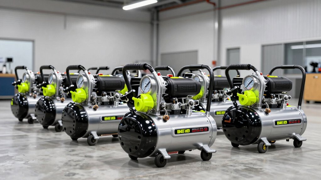If you’re looking for the quietest air compressor, I recommend the California Air Tools Ultra Quiet series. They use advanced noise reduction technology, making them incredibly silent during operation. I’ve found that their oil-free, dual-piston design minimizes sound without sacrificing power. This makes them perfect for indoor use or shared spaces. Trust me, these compressors let you work efficiently without the noise disturbance, keeping your environment peaceful.