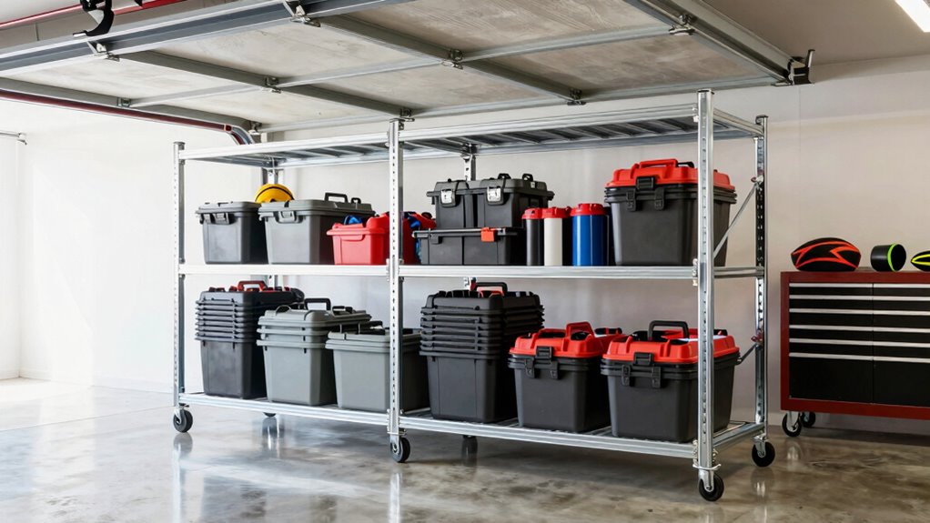 Maximizing vertical space is essential in a garage, and ceiling-mounted storage racks are an excellent way to do that. They free up valuable floor area, giving you more room for vehicles, tools, or workspaces. Depending on the model and adjustability, these racks can add between 60 to 105 cubic feet of extra storage, making a significant difference in organization. The adjustable height feature lets you customize storage for items of various sizes and weights, ensuring everything fits safely and efficiently. Heavy-duty construction means you can store bulky or heavy items without worrying about stability or damage. Plus, modular and expandable designs allow you to connect multiple units, creating a tailored storage solution that grows with your needs. This approach keeps your garage neat and maximizes every inch of space.