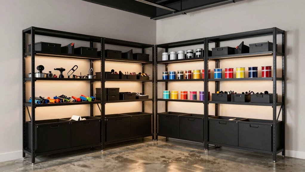 After considering weight capacity, the next important factor is the material and finish of your corner garage shelving unit. I always recommend choosing heavy-duty materials like steel or metal for durability and stability. Some units can support up to 3000 lbs total capacity! Look for rust and corrosion-resistant finishes, especially if your garage tends to be humid. Options like powder-coated or chrome finishes not only enhance longevity but also keep things looking sharp. Don’t forget to check the weight capacity of individual shelves, which can range from 100 lbs to 350 lbs. Adjustable shelving is a game changer, allowing you to customize heights for various items. Finally, evaluate construction quality to avoid sagging and guarantee daily reliability.