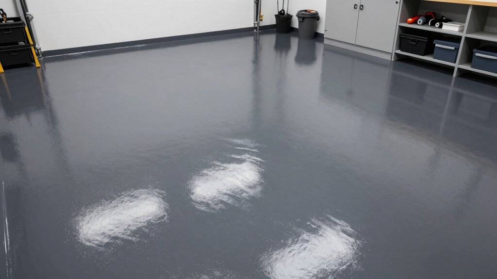 Imagine spilling oil or chemicals on your garage floor—these epoxy kits are surprisingly resistant to stains, making cleanup a breeze. They’re formulated to withstand oils, chemicals, and even minor abrasions, so your floor stays looking fresh longer. I’ve found that high-quality epoxy kits under $800 offer excellent chemical resistance, but it’s always wise to clean spills promptly to maintain their durability and appearance over time.