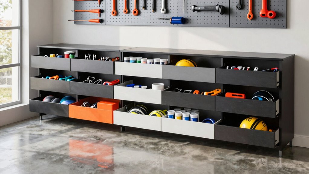 Choosing the right garage cabinet organizer drawers can feel overwhelming, but focusing on a few key features makes the process easier. First, consider storage capacity; the number and size of drawers should fit your tools and items. Larger drawers are great for bigger tools, while smaller ones work well for screws and small parts. Next, assess the design features—look for stackability and interlocking designs that maximize space. Accessibility is vital, so choose cabinets with easy-to-use drawer pulls that minimize spills. Finally, think about mobility and stability; cabinets should have wheels with locking capabilities and anti-tip features to keep them secure. By evaluating these aspects, you’ll find the perfect organizer for your garage.