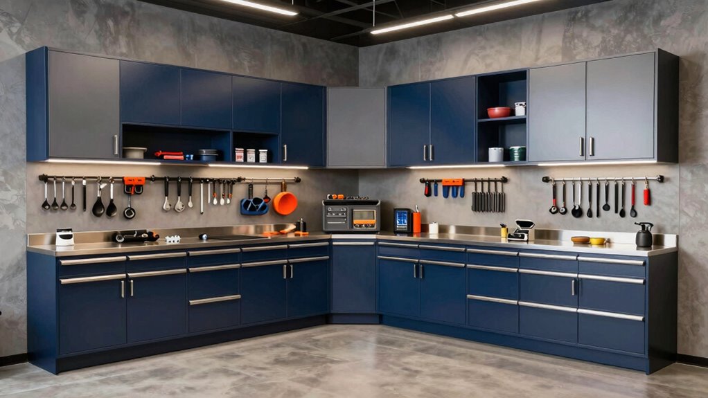 Creating an inviting workspace in my garage goes beyond aesthetics; security’s a top priority too. I always look for garage cabinet sets with lockable doors and drawers to keep my tools and valuables safe. High-quality locking mechanisms, like furniture locks, provide reliable protection against unauthorized access. Some cabinets use key locks, while others offer the convenience of combination locks, which I find handy for quick access. I also appreciate locks made from corrosion-resistant materials, guaranteeing they last in the garage environment. To keep everything secure, I make it a point to regularly maintain the locks, including lubrication and inspection. This way, I can assure that my storage solutions remain dependable over time.
