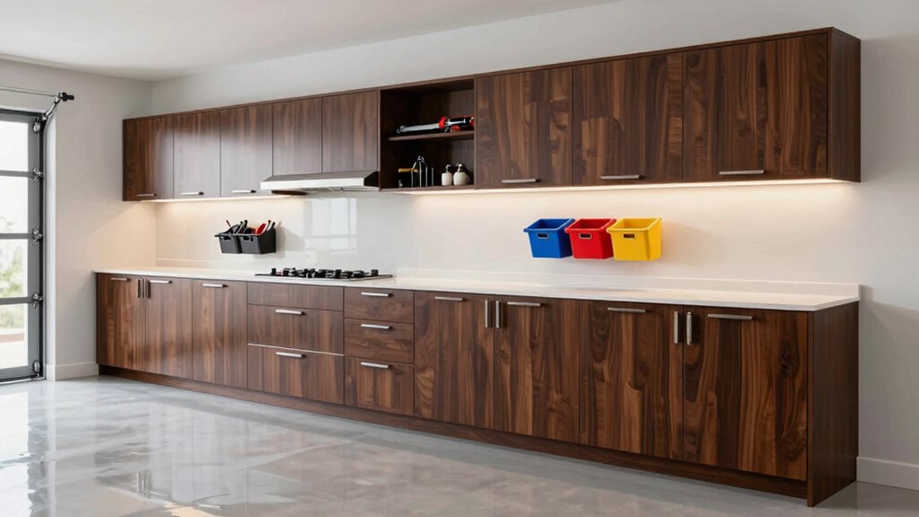 To truly enhance the functionality of garage cabinets, you need a few key accessories. I’ve found that adding pegboards transforms wall space into organized tool storage. Drawer dividers keep smaller items neatly sorted, while shelf risers maximize vertical space. Don’t overlook LED strip lights; they illuminate dark corners, making it easy to find what you need. Trust me, once you incorporate these accessories, your garage’s potential will skyrocket, and you’ll wonder how you managed without them!