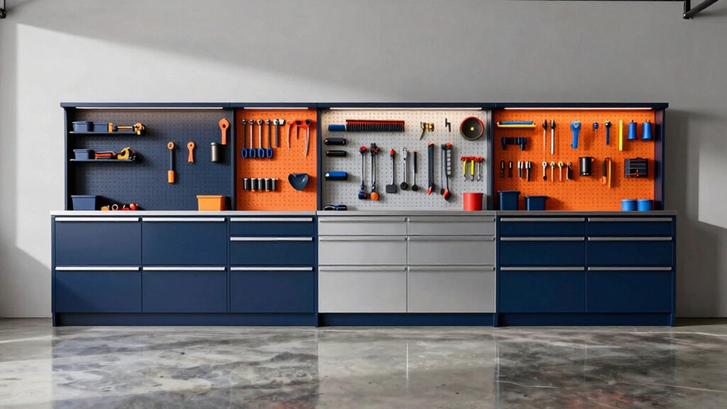 Selecting the right locking mechanism for your garage cabinet with pegboard can greatly enhance both security and convenience. I’ve found that options range from simple key locks to advanced electronic locks, each offering different security levels. If you want selective access, look for cabinets with independent locks for doors and drawers—this way, you can keep certain items more secure. For exceptional security, a three-point locking system is a great choice, as it locks at multiple points to deter unauthorized access. I also appreciate cabinets with built-in magnetic locks—these keep doors securely closed without traditional locks. Plus, having multiple keys can facilitate shared access among users while still maintaining security.