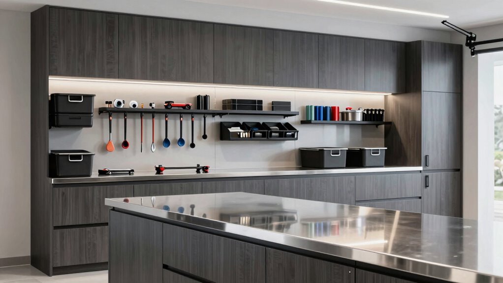 Maintaining garage cabinets with stainless steel countertops is straightforward, but understanding their care requirements guarantees they stay looking their best. Cleaning is simple—just soap and water are enough to keep the surface spotless and fresh. Regularly wiping down the countertop prevents dirt, grease, and grime buildup, which helps extend its lifespan. It’s important to avoid abrasive cleaners or steel wool, as these can scratch or damage the finish over time. Periodic application of stainless steel polish can enhance its shine and add a protective layer against stains and corrosion. Additionally, ensuring proper drainage and promptly cleaning spills are key to preventing stains and maintaining a hygienic surface. With consistent care, your stainless steel countertop will stay durable and attractive for years.
