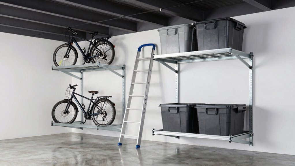 Safety locks act like vigilant guardians, adding an extra layer of security to your ceiling storage. They prevent accidental lowering or lifting, ensuring your priceless or bulky items stay put. I’ve found that these locks give me peace of mind, especially when storing heavier or more delicate items. By securing the lift, safety locks help prevent mishaps, keeping your garage organized and your belongings safe from unwanted surprises.