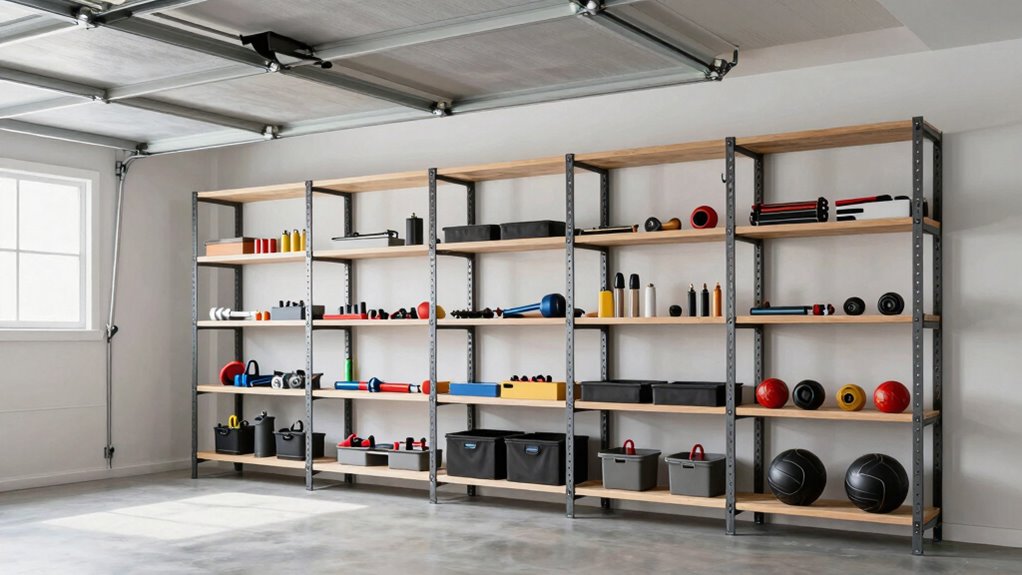 Maximizing storage capacity in low-ceiling garages requires careful consideration of the shelving’s profile and dimensions. To fit comfortably, shelves must be low profile and not block movement or access. It’s crucial to check the maximum height clearance to prevent interference with garage doors or ceiling fixtures. The storage capacity is often limited by the shelves’ height and depth, affecting what and how much you can store. Overhead racks with adjustable heights can help maximize space while preserving clearance. Keep in mind that heavy-duty shelves with higher weight ratings may need more vertical space, which reduces overall capacity in low-ceiling setups. Balancing shelf height, depth, and weight capacity ensures you get the most storage without sacrificing functionality or accessibility.