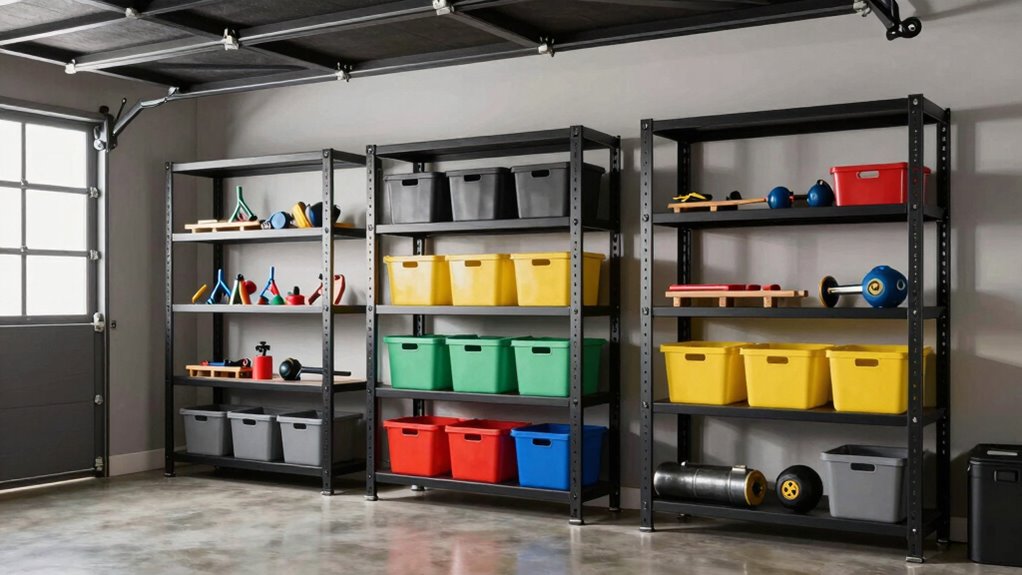 How can adjustable shelf heights revolutionize your garage organization? When I discovered the flexibility of adjustable shelves, it changed everything for me. These shelves let me customize heights in 1-inch increments, making it easy to store everything from tall tools to compact boxes. This adaptability maximizes my vertical space, ensuring I’m not wasting an inch. As my storage needs evolve, I can easily modify my setup, keeping my garage neat and efficient. Plus, adjustable shelves aren’t just for garages; they work well in kitchens or basements too. By choosing a shelving unit with adjustable heights, I guarantee efficient use of my space, making it a smart investment for any homeowner looking to stay organized.