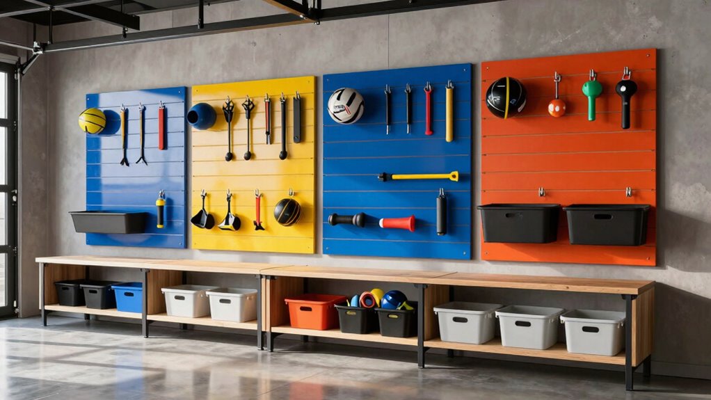 Garage slatwall panels typically come in standard dimensions of 4 x 8 feet, offering a generous 32 square feet of coverage once installed. If you’re looking for flexibility, you’ll find smaller sections, like 1 x 4 feet, make handling and customizing easier. By combining multiple panels, I can tailor larger display areas to fit my specific storage needs perfectly. Plus, the vertical orientation of these panels maximizes my usable wall space, effectively organizing tools and equipment. It’s also vital to take into account the weight capacity per square foot, which can vary from 75 to 300 pounds. This guarantees that the panels meet my storage requirements without compromising safety or stability. Choosing wisely can make a big difference!