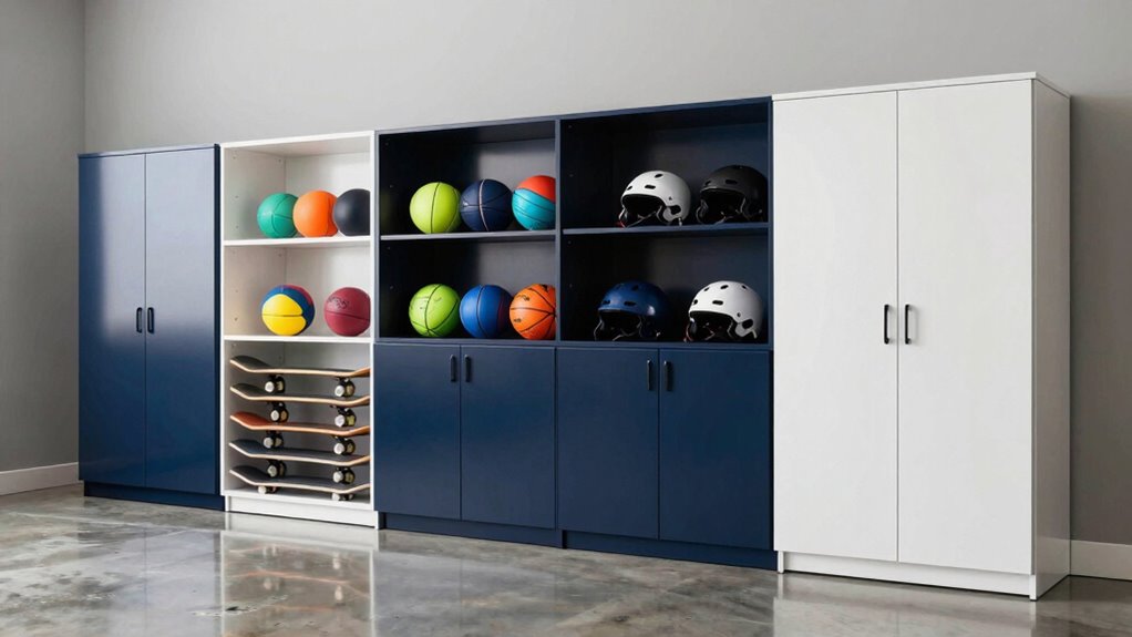 Durability is an essential factor in selecting garage storage cabinets for sports gear. I always look for high-quality materials like heavy-duty steel or alloy because they resist corrosion, rust, and scratches, which helps them last longer. Powder-coated finishes add extra protection against environmental factors, making them perfect for varied garage conditions. I also favor cabinets with reinforced construction; some can hold up to 180 lbs per shelf, ensuring they can handle heavier sports equipment. Anti-tipping features are vital too, especially in homes with kids around. By considering weight limits and material robustness, I can confidently choose cabinets that withstand daily wear and tear, keeping my gear safe and organized for years to come.