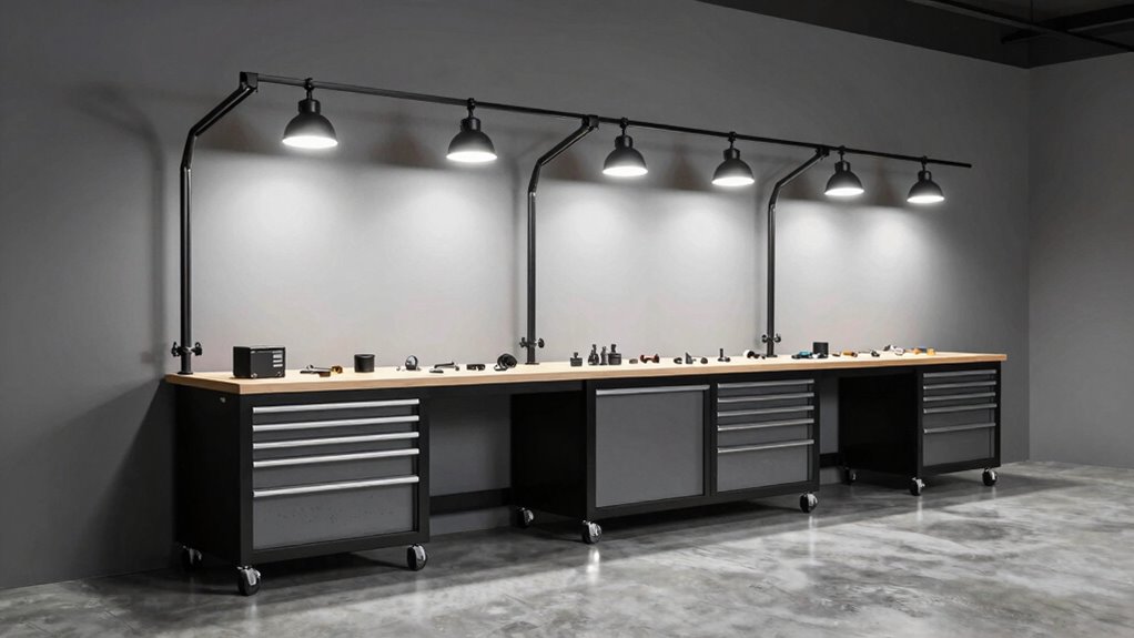 They say, “a penny saved is a penny earned,” and that’s true for garage lighting too. I opt for energy-efficient LED fixtures, which use less power and last longer. Look for options with good lumens-to-watt ratios and ENERGY STAR certification. Not only do I save on electricity bills, but I also reduce my carbon footprint. These lights are bright, durable, and eco-friendly—perfect for any workbench.