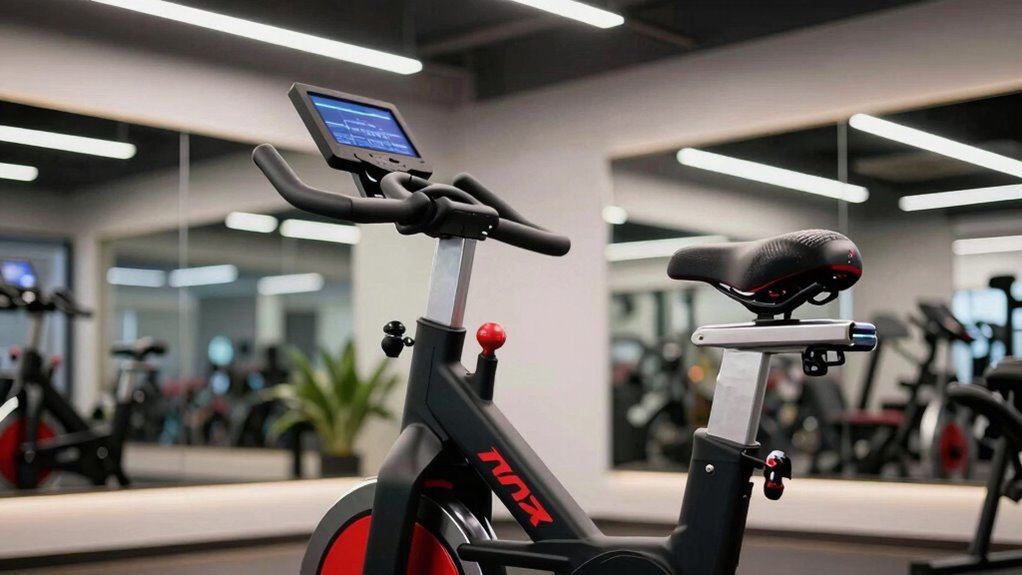 Choosing an indoor cycling bike involves more than just size and storage; noise levels and comfort also play an essential role in creating a pleasant workout experience. Bikes with belt drives are particularly quiet, often operating below 25dB, making them ideal for home use without disturbing others. Magnetic resistance systems tend to produce less noise than chain-driven models, enhancing your workout environment. Comfort features like adjustable seats and handlebars allow you to customize your riding position, reducing strain during long sessions. Additionally, shock-absorbing seats and vibration-dampening pedals can make rides more comfortable. Noise-reduction features, such as insulated frames and silent drives, further minimize sound, helping you stay focused and relaxed while exercising.