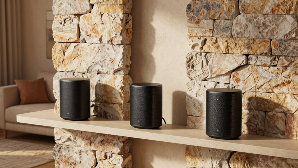 Given the challenges posed by thick walls, the flexibility of a mesh network becomes essential in maintaining strong, reliable coverage throughout your home. Systems with multi-gigabit wired backhaul, like 2.5 Gbps ports, reduce wireless interference and improve overall coverage. AI-driven mesh systems that optimize device connections and load balancing help maintain strong signals through dense materials like brick or concrete. High-gain antennas and beamforming technology, common in outdoor or multi-room mesh systems, further enhance penetration. Strategic placement of nodes—on different sides of walls or areas with interference—can considerably boost performance. Additionally, dual or tri-band Wi-Fi with dedicated backhaul bands frees bandwidth for devices, ensuring stable connections even in challenging environments. Flexibility in these areas is key to overcoming thick wall barriers.