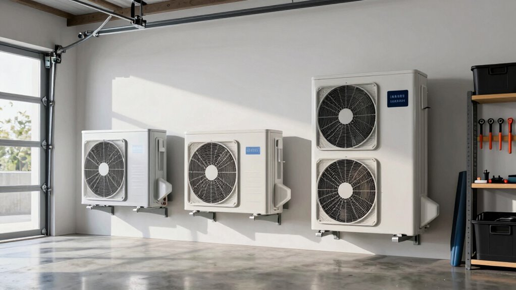 Climate plays a crucial role in determining the right mini split size for your 800 sq ft garage, as temperature extremes and humidity levels directly impact system performance. In colder regions, you’ll need a more powerful unit to guarantee effective heating during winter. High humidity levels can also influence your choice, especially if dehumidification is a priority, affecting overall efficiency. Areas with significant temperature fluctuations require a system with a broad operating temperature range to maintain comfort year-round. In hot or humid climates, a higher BTU capacity might be necessary to handle the persistent heat and moisture. Additionally, seasonal variations may call for a dual-zone system with both heating and cooling functions, ensuring consistent comfort regardless of weather changes.