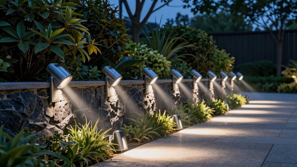 Choosing the right outdoor motion sensor light depends heavily on its detection range, which determines how far the sensor can detect movement. Longer ranges, like 30 to 50 feet, are perfect for large yards or driveways, while shorter distances work well for small porches or garden beds. Keep in mind, environmental factors such as trees, weather, or structures can reduce the effective detection distance. A wider sensor angle helps cover more area at longer ranges, but proper placement and height are essential to maximize detection and avoid false triggers from distant sources. Ultimately, selecting a sensor with the right range guarantees your outdoor space is both well-lit and secure without unnecessary activations.