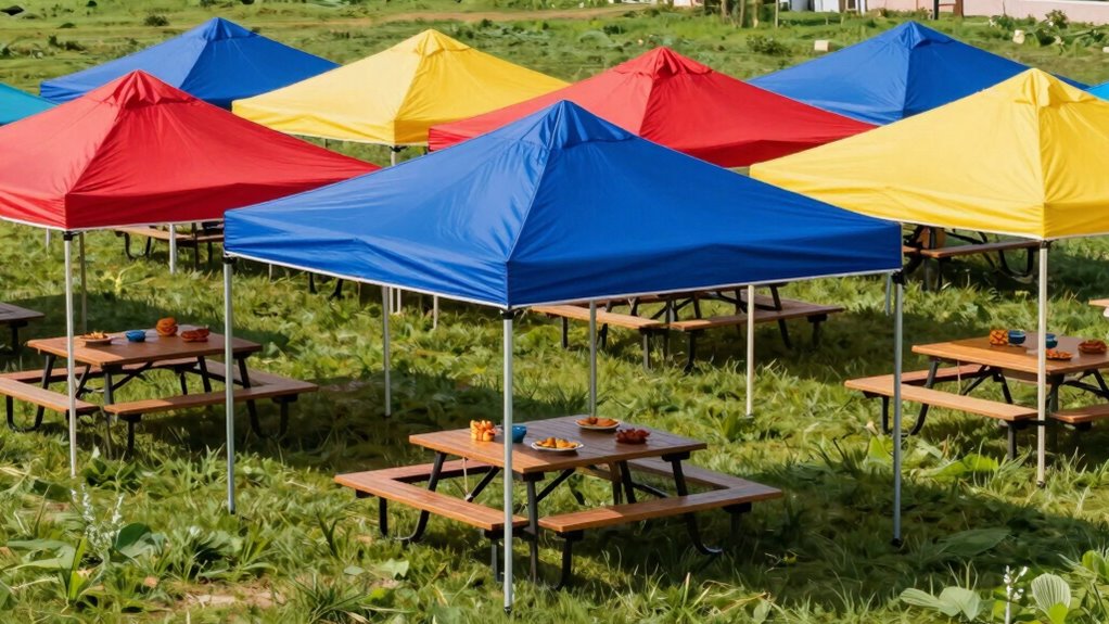 Opting for a durable pop-up canopy means paying close attention to the materials used in its construction. High-quality fabrics like 150D or 210D Oxford material are essential because they resist tearing and UV damage, ensuring the canopy lasts through frequent use. The frame should be made from corrosion-resistant steel or aluminum, which can withstand outdoor elements and won’t rust over time. Reinforced joints and stress points are vital, as they boost the overall durability and help the canopy endure various weather conditions. For added safety and longevity, look for flame-resistant fabrics rated CPAI-84, which guard against fire hazards. Additionally, water-resistant fabric with UV protection maintains the canopy’s integrity and performance, making it a reliable choice for outdoor events.