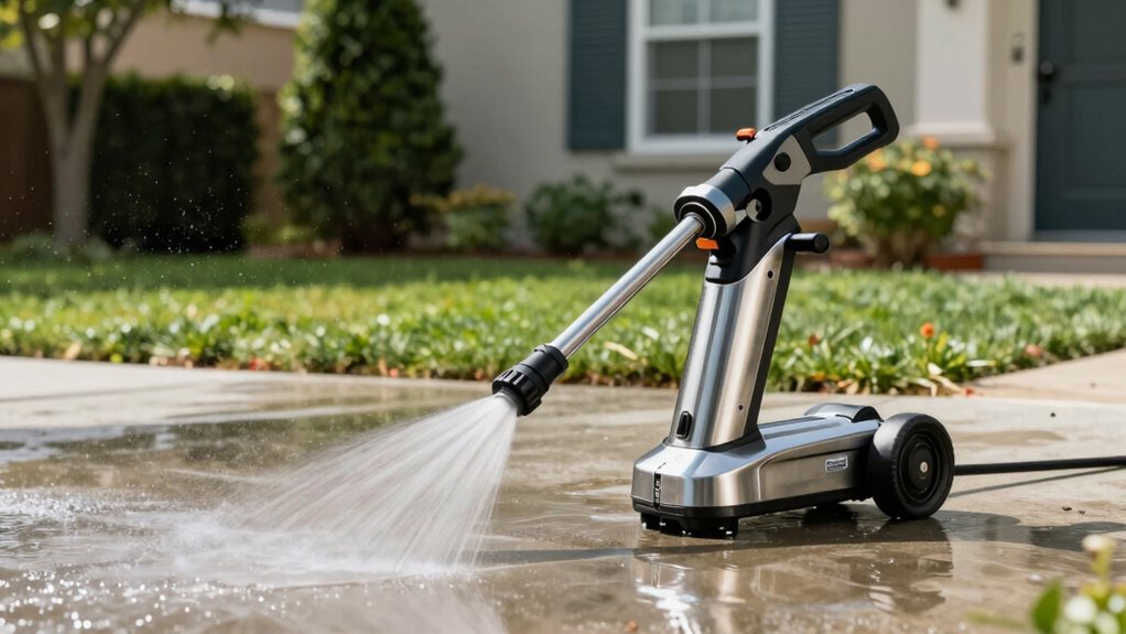 Maneuverability features play a vital role in how effectively you can clean large, flat surfaces with a 20-inch pressure washer surface cleaner. Look for models with four wheels and dual handles, which guarantee smooth, effortless movement across surfaces. Adjustable handles improve control and comfort during extended cleaning, reducing fatigue. Wheels that keep a consistent nozzle height help prevent surface damage and assure even cleaning results. Swivel or rotating wheels make changing direction easier, boosting efficiency on expansive areas. A lightweight frame and stable base are essential, allowing you to move the cleaner easily without tipping or dragging. These features make your cleaning tasks more manageable and help you achieve professional results with less effort.