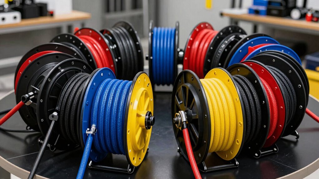 The durability of a retractable air hose reel hinges on the quality of its construction materials, which directly affect its lifespan and performance. Heavy-duty steel, reinforced hybrid polymers, and impact-resistant polypropylene are common choices that withstand demanding conditions. Weather-resistant features like UV stabilization and freeze-resistant hoses guarantee reliable outdoor use in extreme temperatures. Brass fittings are essential for their corrosion resistance and leak-proof connections, extending the reel’s life. The hose’s resistance to abrasion, water, oil, and temperature fluctuations also plays a vital role in durability. Heavy-duty construction with corrosion-resistant powder coatings and reinforced hoses makes these reels suitable for both industrial and DIY environments, ensuring they stand up to regular use and harsh conditions over time.